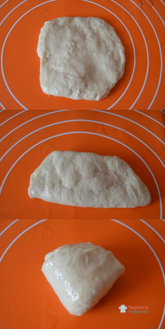 Tekrar fırçayla sıvı yağ sürüp üçgen olacak şekilde hamuru sağ tarafa katlayın.
